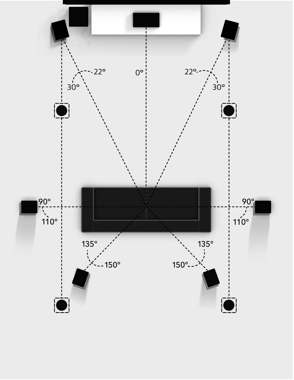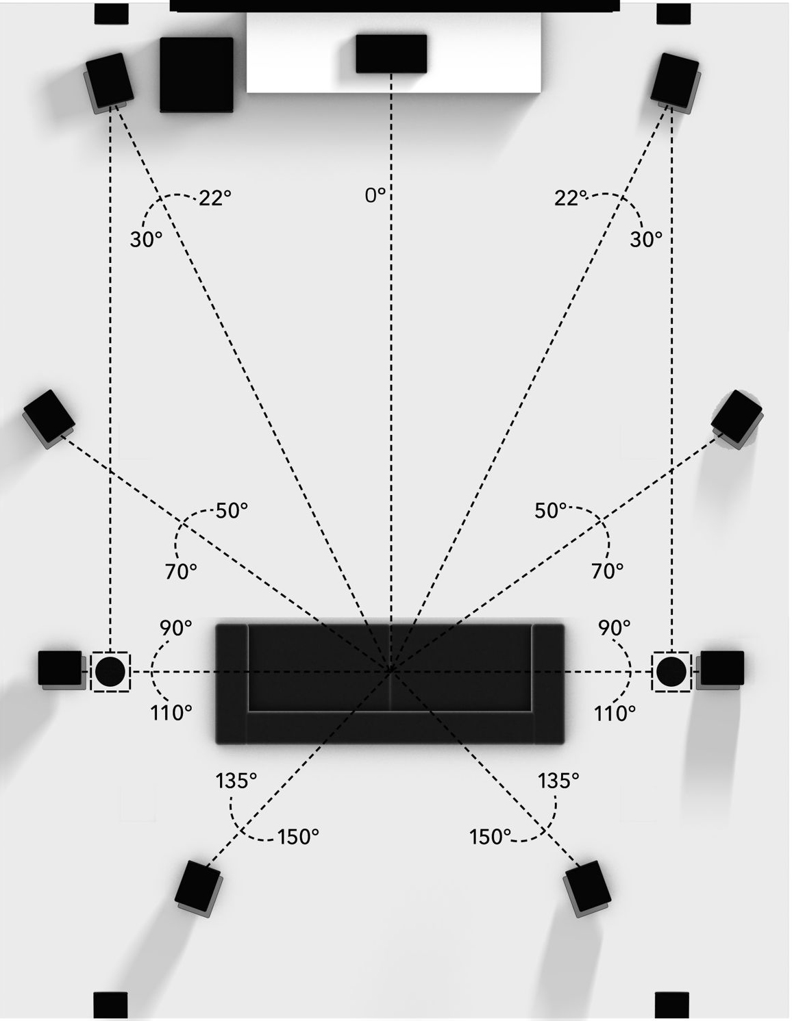 此系统同时播放多达 9.1 声道。采用5.1.4扬声器布局。
