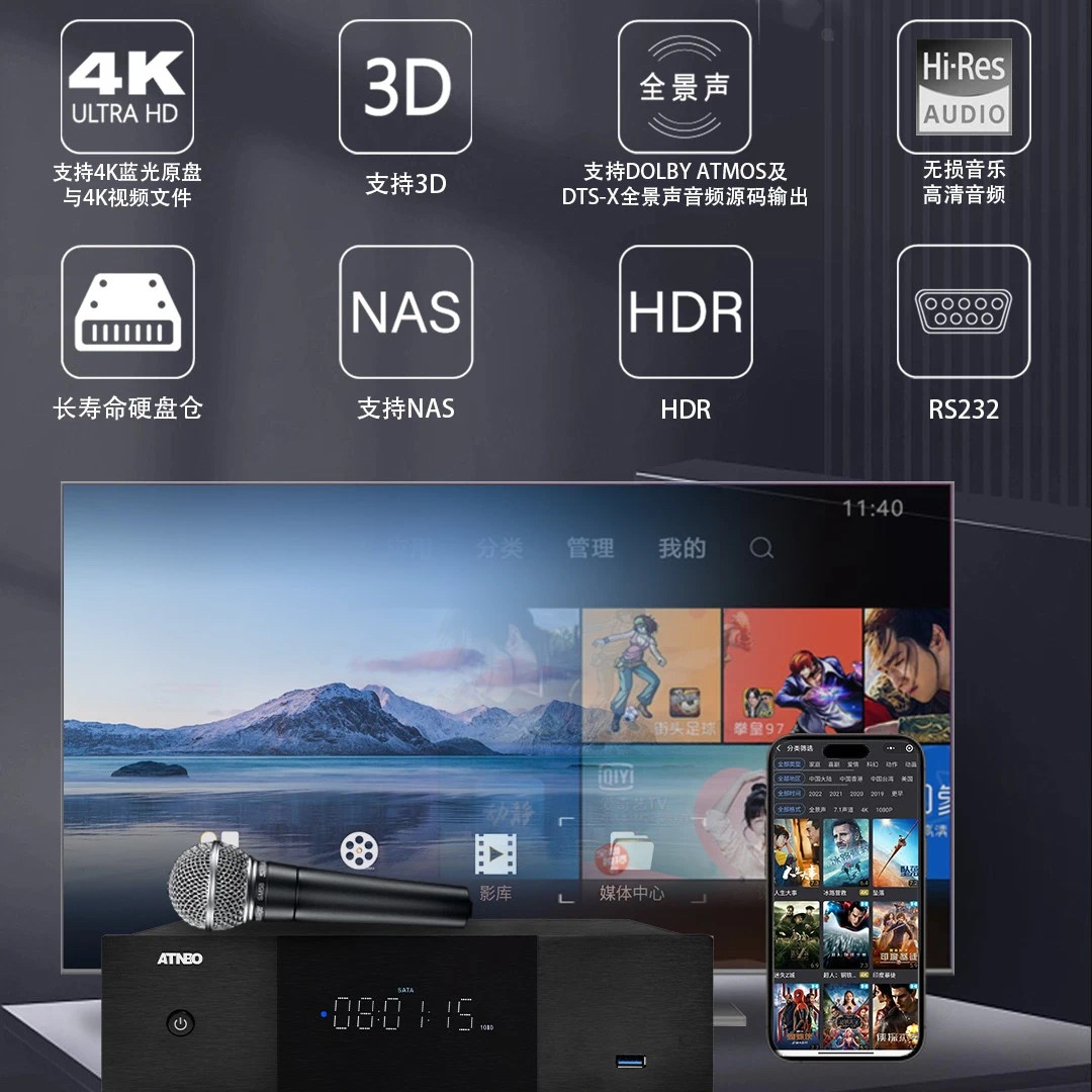 支持Dolby Atmos、DTS:X、DTS:X Pro、IMAX Enhanced和Auro-3D。配备更新的HDMI接口,支持8K/60Hz和4K/120Hz传输、VRR、ALLM、动态HDR、HDR10+和eARC。